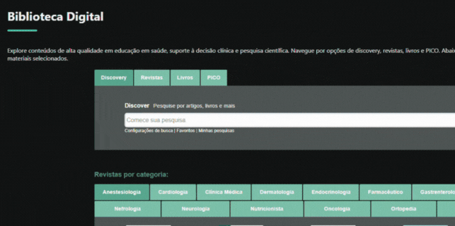 Explore conteúdos de alta qualidade em educação em saúde, suporte à decisão clínica e pesquisa científica. Navegue por opções de discovery, revistas, livros e PICO. Selecione sua especialidade de interesse e acesse gratuitamente materiais selecionados.